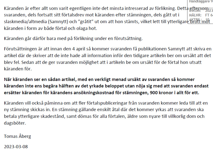 Om den begärda ursäkten publiceras i det Åberg kallar ”slaskmedia/altmedia”, kommer skadeståndskravet mot kvinnan dras tillbaka helt och hållet, påstås det.