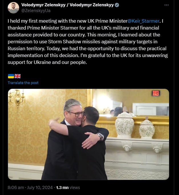 ”Under morgonen fick jag veta att vi tillåts använda Storm Shadow-missiler mot militära mål på ryskt territorium. Idag hade vi möjlighet att diskutera den praktiska tillämpningen av det beslutet.”