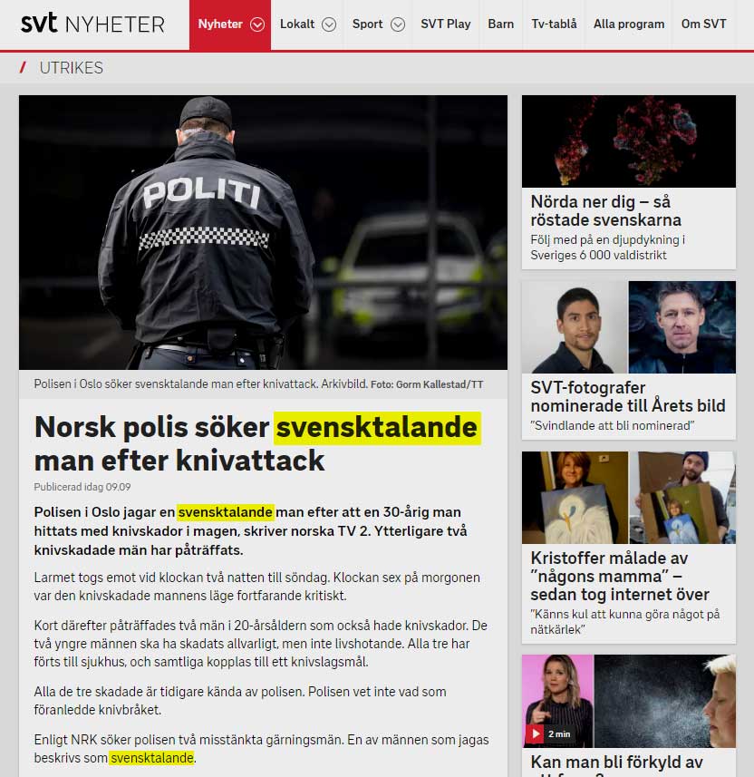 SVT utelämnar i sin rapportering helt de eftersökta gärningsmännens signalement. Däremot framhäver man på tre ställen – i rubrik, ingress och brödtext – uppgiften att de är svensktalande.