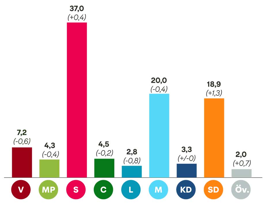 På den rödgröna sidan är det Socialdemokraterna som fortsätter att vinna väljare på att vara i opposition. Ökningen i den aktuell mätningen är dock blygsam och stannar på 0,4 procentenheter.
