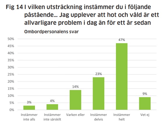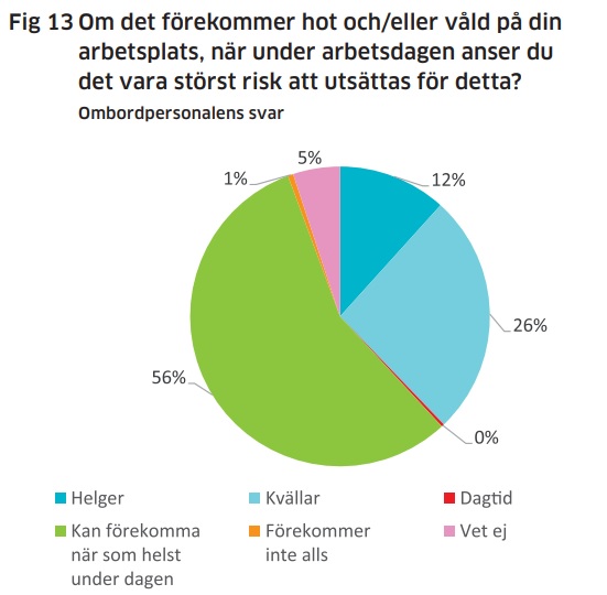 I rapporten vittnar hela 56 procent av ombordpersonalen om att de upplever att det förekommer hot och våld och att det inte är vid någon särskild tidpunkt som detta inträffar.