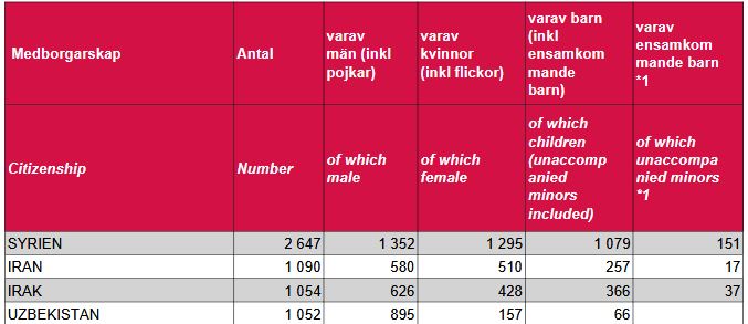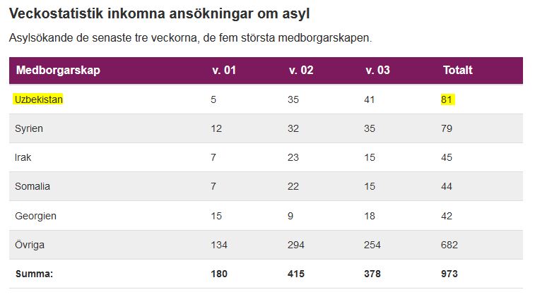 Enligt ny veckovis statistik från Migrationsverket har antalet uzbeker som söker asyl i Sverige gått om syrierna och därmed blev uzbekiska medborgare den största gruppen asylsökande under januari. Enligt siffror från 2018 tog Sverige emot 740 uzbeker – medan resten av EU tog emot 280 uzbekiska medborgare, sammanlagt.