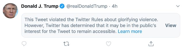 Ett nytt fall av kontrovers med Twitter har uppstått sedan en tweet av Donald Trump gömts undan på grund av vad den sociala mediejätten hävdar är ”glorifierade våld”. Man tog inte bort presidentens meddelande men försedde det med en varning som hindrar folk från att se tweeten om man inte först klickar på varningstexten. Igår skrev Trump under en presidentorder som syftar till att ta bort det legala skyddet från sociala mediejättar med anledning av deras som presidenten menar politiskt partiska agerande.