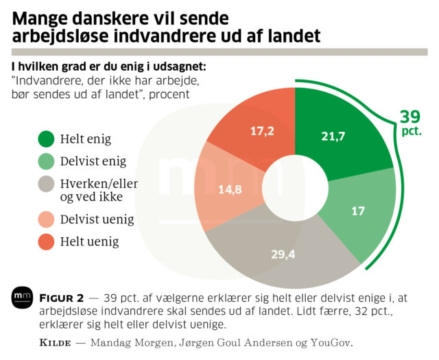 Tidningens undersökning visar även att 39 procent av de tillfrågade anser att invandrare som saknar arbete bör utvisas ur landet. Det är värt att poängtera att väsentligt färre – endast en av tre danskar eller 32 procent – motsätter sig detta.
