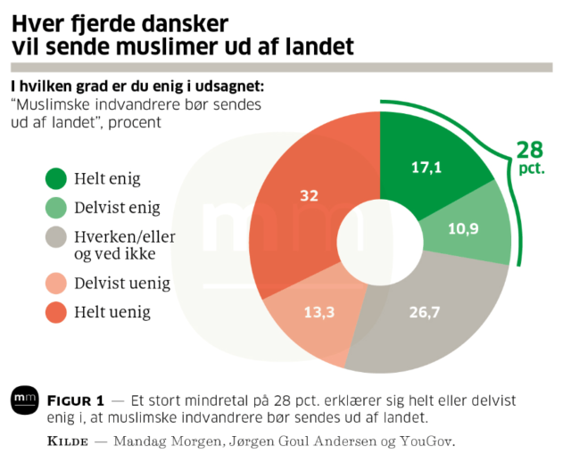 Det framgår av undersökningen, i vilken över 5 900 personer deltog, att mer än var fjärde dansk – 28 procent – är anser att muslimska invandrare ska utvisas från landet. Mindre än hälften, 45 procent, av danskarna motsätter sig att utvisa muslimer från landet: