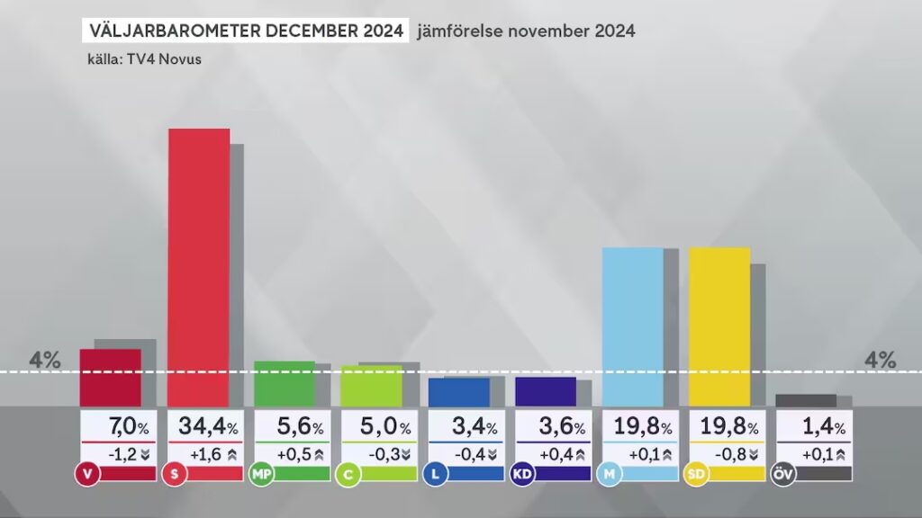 I Sentios decembermätning ser det delvis annorlunda ut – där får Sverigedemokraterna en push och är betydligt större än Moderaterna, som tappar rejält.