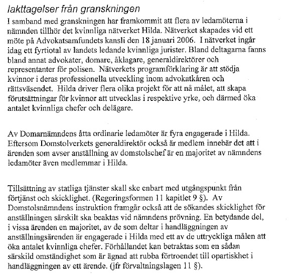 ”Av Domarnämndens åtta ordinare ledamöter är fyra engagerade i Hilda. Eftersom Domstolsverkets generaldirektör också är medlem innebär det att i ärenden som avser anställning av domstolschef är en majoritet av nämndens ledamöter även medlemmar i Hilda”, står att läsa i rapporten.