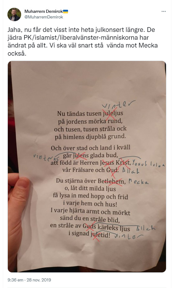Centerpartiets blivande partiledare Muharrem Demirok skapade inför julen 2019 en egen version av julpsalmen ”Nu tändas tusen juleljus”, där Gud bytts ut mot Allah och Betlehem mot Mecka. Det framgår av inlägg på Twitter.