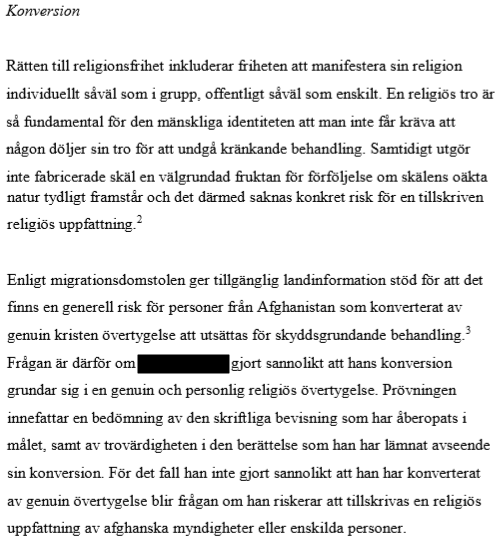 Utdrag ur domen. Domstolen redogör för vad som krävs för att få flyktingstatus genom att bli kristen.