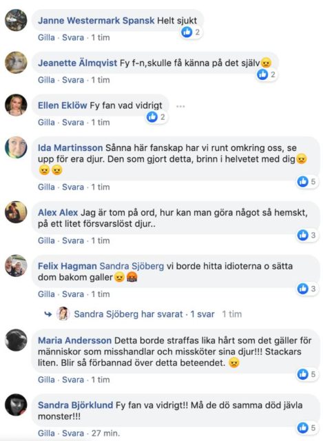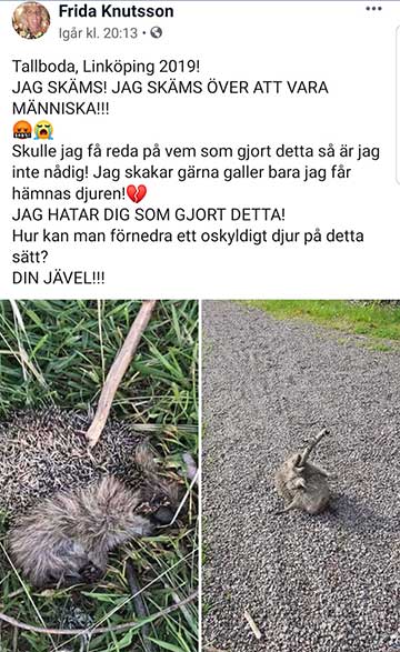 Nyligen rapporterade Samhällsnytt om hur en katt blivit torterad av cigaretter. Nu uppmärksammas ett nytt fall där en igelkott spetsats på en pinne. ”Hur kan man förnedra ett oskyldigt djur på detta sätt? DIN JÄVEL!!!”, skriver en kvinna som uppmärksammat övergreppet.
