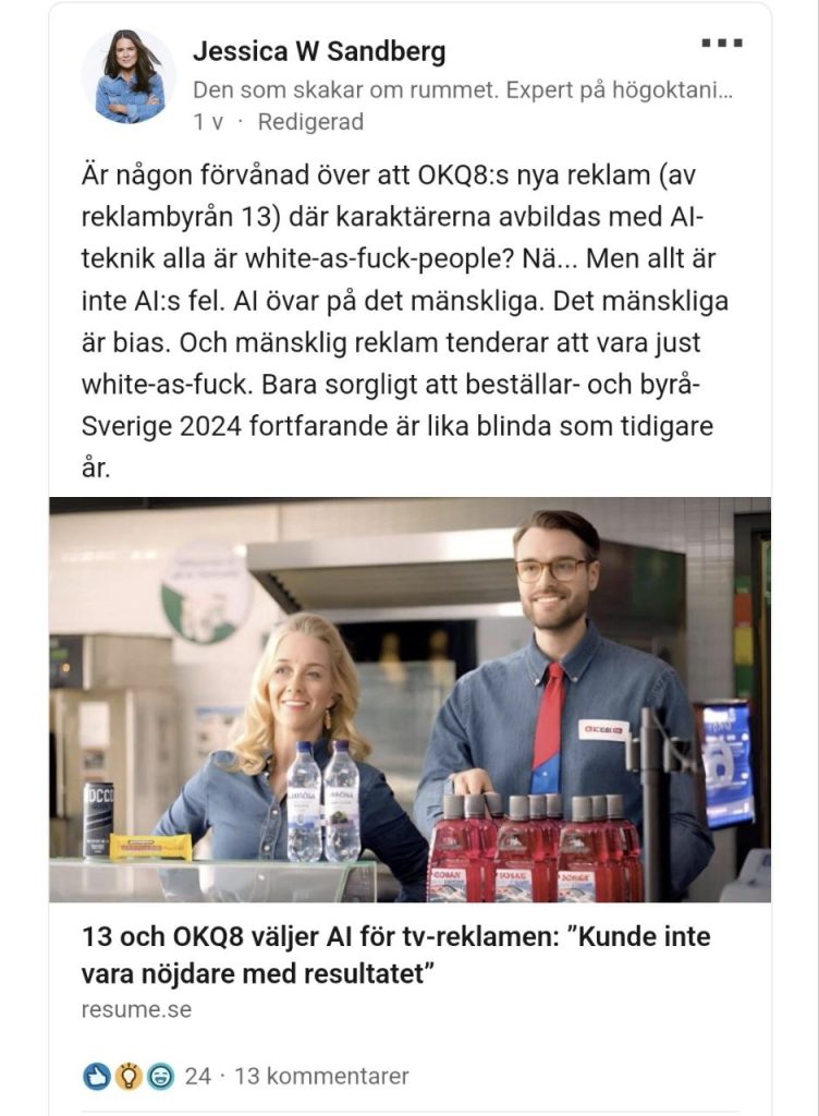 Ett samarbete mellan OKQ8 och reklambyrån 13 resulterade i en reklamfilm genererad av artificiell intelligens, AI, som både parter sade sig vara jättenöjda med – men från annat håll rasas det då filmen påstås ha för många vita människor.