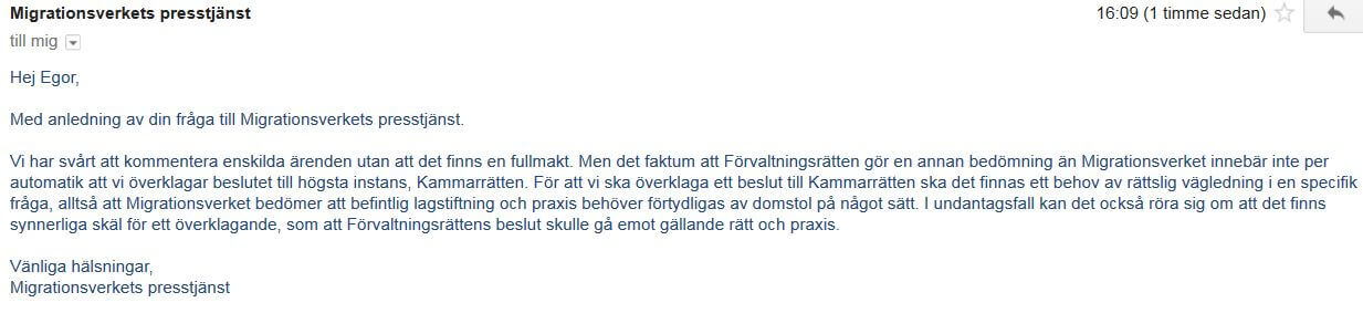 Efter flera telefonsamtal fick vi äntligen ett mejlsvar från presstjänsten. Av mejlsvaret som visas nedan i sin helhet framgår att myndigheten inte avser att överklaga migrationsdomstolens dom: