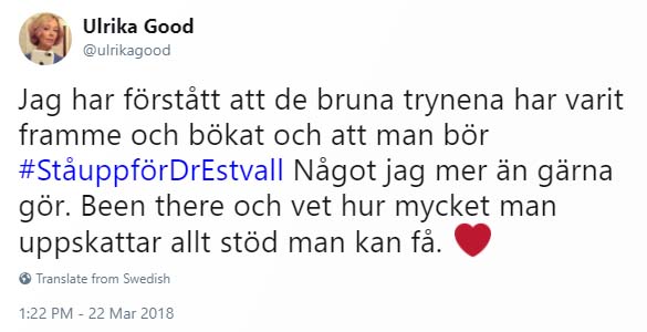 ”Jag har förstått att de bruna trynena har varit framme och bökat och att man bör #StåuppförDrEstvall Något jag mer än gärna gör. Been there och vet hur mycket man uppskattar allt stöd man kan få”, twittrar hon.