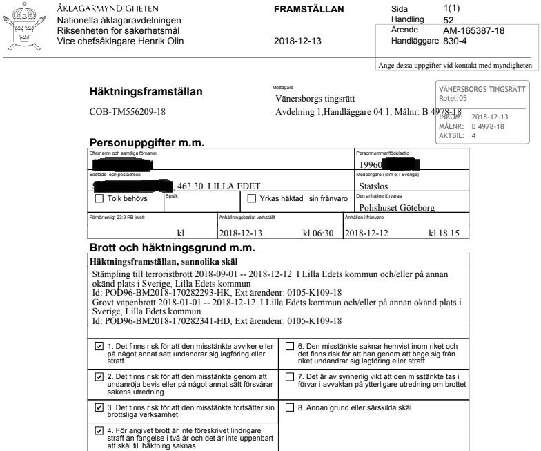 Enligt häktningsframställan från Vänersborgs tingsrätt som Samhällsnytt har tagit del av häktades idag en 22-årig statslös man på sannolika skäl för stämpling till terroristbrott och grovt vapenbrott. Samhällsnytt har gått igenom mannens bakgrund som kan ge mer detaljer om det misstänkta brottet och mannens motiv.