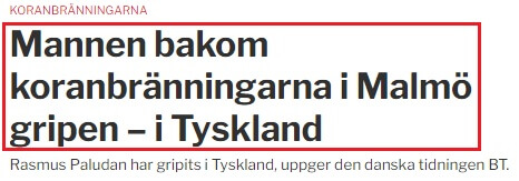 När Sydsvenskans reporter Oskar Ahlqvist rapporterar om nyheten att den danska partiledaren har gripits vid inresa i Tyskland passar man på att trycka ut att ”mannen bakom koranbränningarna i Malmö” är gripen.
