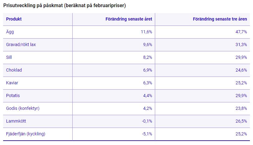 I februari låg de genomsnittliga priserna på livsmedel 0,9 procent högre än i februari i fjol, men när det gäller maten på påskbordet har de flesta produkterna stigit ännu mer i pris.