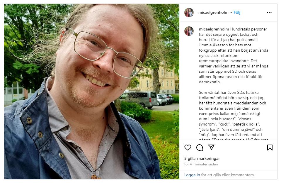 I ett inlägg på sociala medier publicerat på onsdagen påstår Micael Grenholm att kritiker måste vara ”SD:s hatiska trollarmé” som börjat höra av sig. Han ska även ha fått för sig att ”någon SD:are ska anmäla MIG för hets mot folkgrupp pga det jag skriver om Jimmie”.