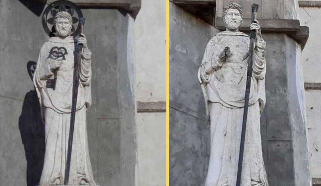 Petrus-statyn före och efter Guds varning. Bild: Faksimil X.