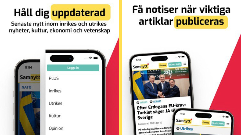 För att börja använda Samnytt-appen: gå till Apple App Store eller Google Play Store, sök efter Samnytt, ladda ner appen och logga in med ditt Plus-konto. Det är helt gratis som en del av din prenumeration.