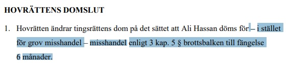 Hassan överklagade tingsrättsdomen till Svea hovrätt som mildrade både rubriceringen från grov misshandel till misshandel och fängelsestraffet till 6 månader.