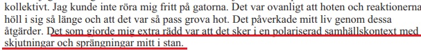 Det framgår av polisförhör att von Sivers tar hoten på allvar och känner en extra stark rädsla för hoten eftersom oroligheter som skjutningar och sprängningar kommer allt närmare hennes liv i huvudstadens centrala delar.