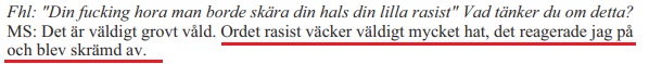 Artisten som är folkbokförd i det invandrartäta och enligt polisen så kallade utsatta området Hässelby väster om Stockholm fick frågor om hur han glorifierar ett gängkriminellt liv med både narkotikahandel och skjutningar. Det var något som hans följarbas inte uppskattade och började dra fram rasistkort i sociala medier.