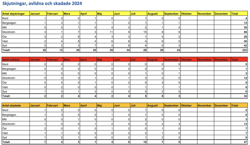 Fram till den 1 oktober har Polismyndigheten registrerat 222 skjutningar, 34 döda och 47 skadade. Sedan 1 oktober och fram till dagens datum har det enligt nyhetsrapporteringen skett flera nya skjutningar och mord i gängmiljön men en ny sammanställning från myndigheten dröjer till månadsskiftet.