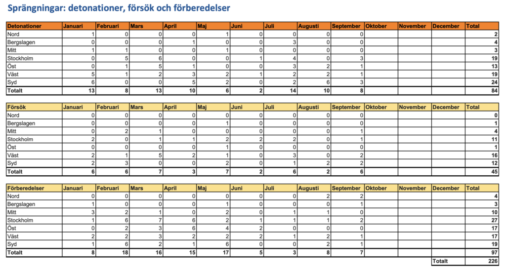 Hittills i år, fram till den första oktober, har polisen registrerat 84 bombdåd. Vidare 45 försök till bombdåd och 97 förberedelser har stoppats.
