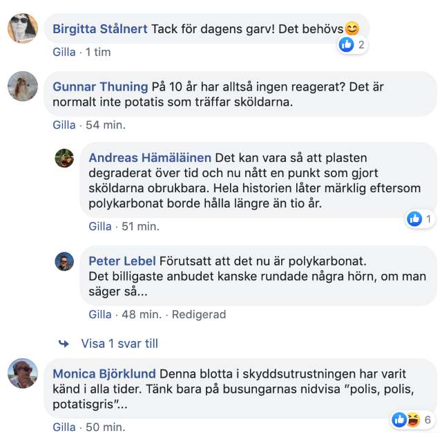 Det var efter ett antal incidenter som polisen i region Syd beslutade sig för att genomföra tester av sköldarna, bland annat genom att kasta potatis mot dem, och det var då man upptäckte problemet, rapporterar Polistidningen. Skölden sprack nämligen.