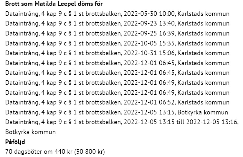 Den 5 juli meddelade Stockholms tingsrätt att Matilda Leepel döms för flera fall av olaga dataintrång. Rätten anser att 70 dagsböter om 440 kronor är en lämplig påföljd.