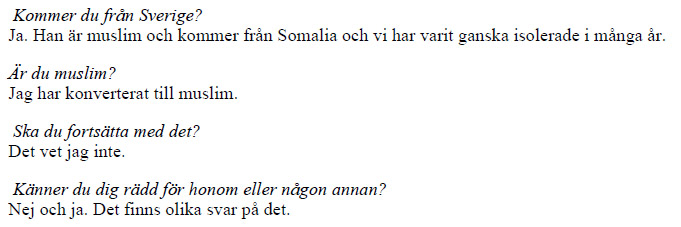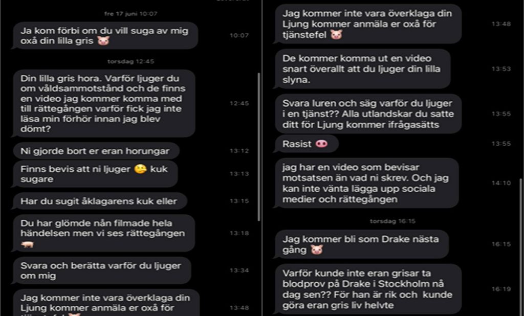 Omar letar upp telefonnumret till den poliskvinna som deltagit i gripandet och skickar ett stort antal textmeddelanden till henne där han bland annat kallar henne för ”slyna”, ”gris hora”, ”smutsiga gris” och ”jävla tjockis”.