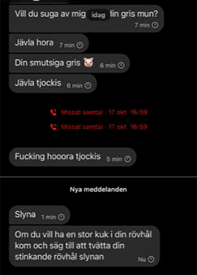 Han skriver även att hon ska suga av honom och frågar om hon vill ha ”en stor kuk i din rövhål”.