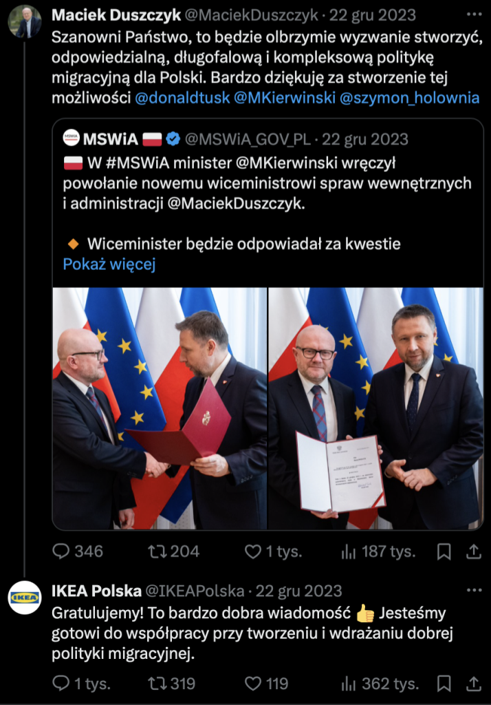 För tre veckor sedan gratulerade IKEA:s pressavdelning Maciej Duszczyk till posten som ny vice inrikesminister. ”Vi är redo att samarbeta i utvecklingen och genomförandet av en bra migrationspolitik”, skrev IKEA Polska på X. Duszczyk är ansvarig för migrationsfrågor.