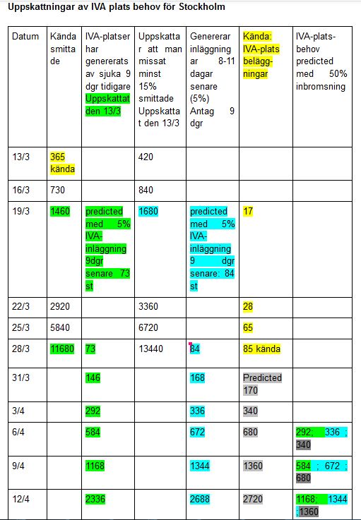 Cecilia Söderberg-Nauclér har publicerat en uppskattningsmodell på sin twitter som visar att behovet av intensivvårdsplatser i Stockholm kommer att bli betydligt större än vad Folkhälsomyndigheten planerat för. I förklaringen till modellen berättar hon att hon redan i början av mars såg att något inte stämmer i Folkhälsomyndighetens uttalanden: