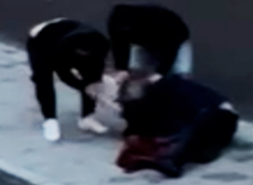 De hoppar på företagaren, slår honom till marken och fortsätter sedan misshandeln med sparkar och slag medan deras offer ligger ned. De tar hans Rolex-klocka, och försvinner därefter springandes från platsen.