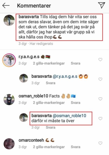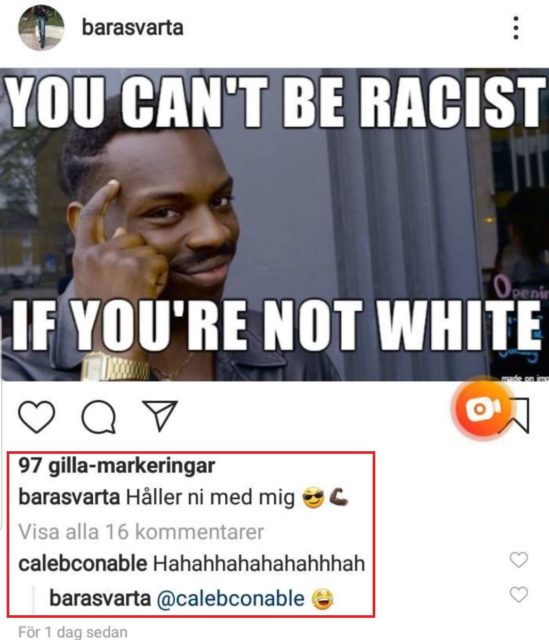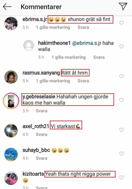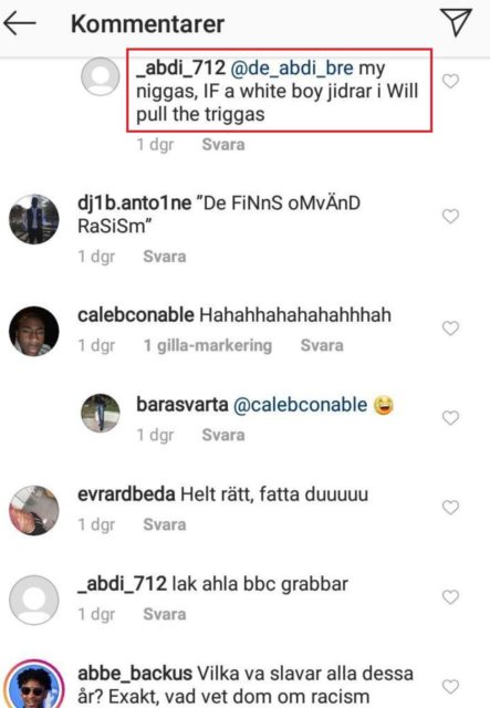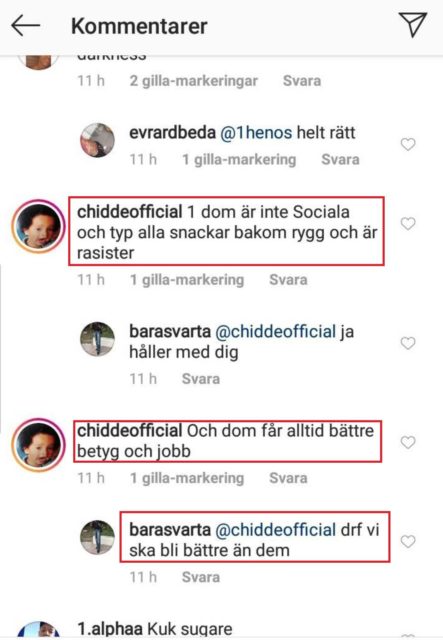 I kommentarerna skriver en ”Chidde” ut sitt hat mot vita eftersom dessa påstås vara osociala och ”typ alla snackar bakom rygg och är rasister”. Vidare anser Chidde att vita ”alltid” får bättre betyg och jobb.