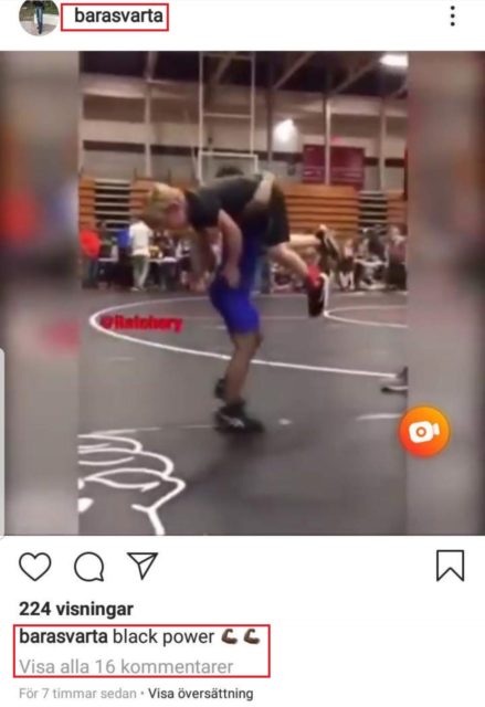 Kontot visar även ett videoklipp där en vit pojke brottas ned av en svart pojke i en gymnastikhall. Under videoinlägget står det ”black power” och sedan följer flera jublande kommentarer där de gläds åt att den vita pojken blev nedslagen.