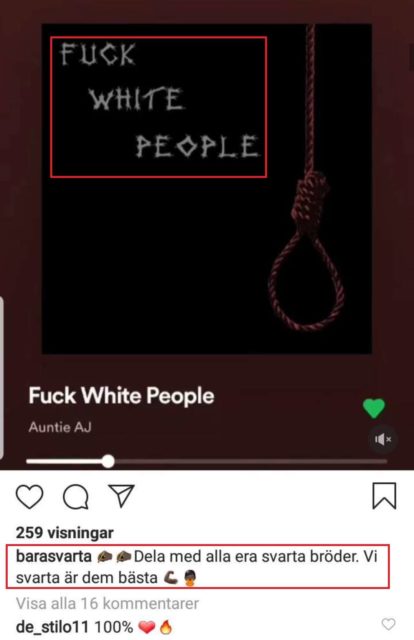 I flera inlägg sprider artisten hat mot vita. I ett inlägg med en snara står det ”Fuck White People” och sedan ”Vi svarta är dem bästa”.