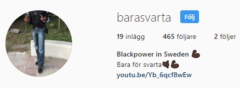 På ett nyregistrerat och låst Instagramkonto med namnet ”barasvarta” har flera videoklipp med JCBUZ laddats upp. I presentationstexten för kontot som hittills har 465 följare går det att läsa: ”Blackpower in Sweden” och ”Bara för svarta”.