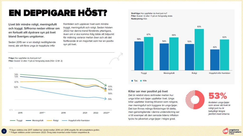Nyligen släpptes rapporten Back2School 2023 av Ungdomsbarometern där en allt mörkare bild av tillvaron bland unga framkommer. Sedan 2015 har bland annat otryggheten ökat kraftigt och många ser dystert på livet.