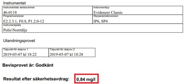 1,7 promille Vid utandningsprovet mättes 0,84 gram alkohol per liter utandningsluft vilket motsvarar omkring 1,7 promille.
