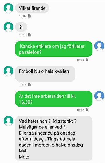 ”Fotboll Nu o hela kvällen” svarar han bland annat på vår begäran om att få prata med honom på telefon. Klockan är 16.14 på måndag den 18 juni. Enligt Åklagarmyndighetens löneadministration var det ordinarie arbetstid på myndigheten – fram till kl. 16.30. Det finns inte heller någon anmälan om tjänsteledighet för den tiden för Mats Wihlborg.