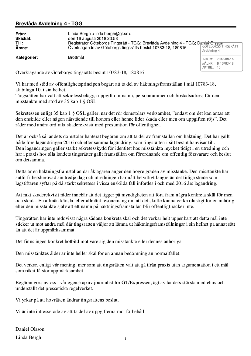 Sekretessbeslutet har överklagats av Samhällsnytt men också av msm-medier. Nedan en kopia på överklagan per mejl som skickats till Göteborgs tingsrätt av Expressen/GT:s biträdande nyhetschef Linda Berg där man argumenterar att sekretessbeslutet är felaktigt utifrån vad som sägs i Sekretesslagen om på vilka grunder sådana inskränkningar i offentlighetsprincipen får göras (klicka för större bild):