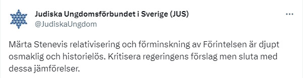 ”Märta Stenevis relativisering och förminskning av Förintelsen är djupt osmaklig och historielös. Kritisera regeringens förslag men sluta med dessa jämförelser”, skriver ungdomsförbundet på samma sociala medium.