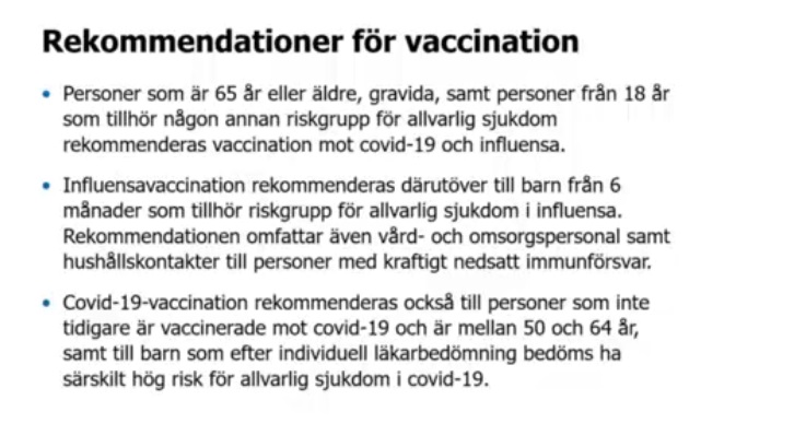 De som rekommenderas vaccination mot covid-19 uppmanas också se till att få det gjort snart. Detta ”för att bidra till en så frisk höst och vinter som möjligt”.