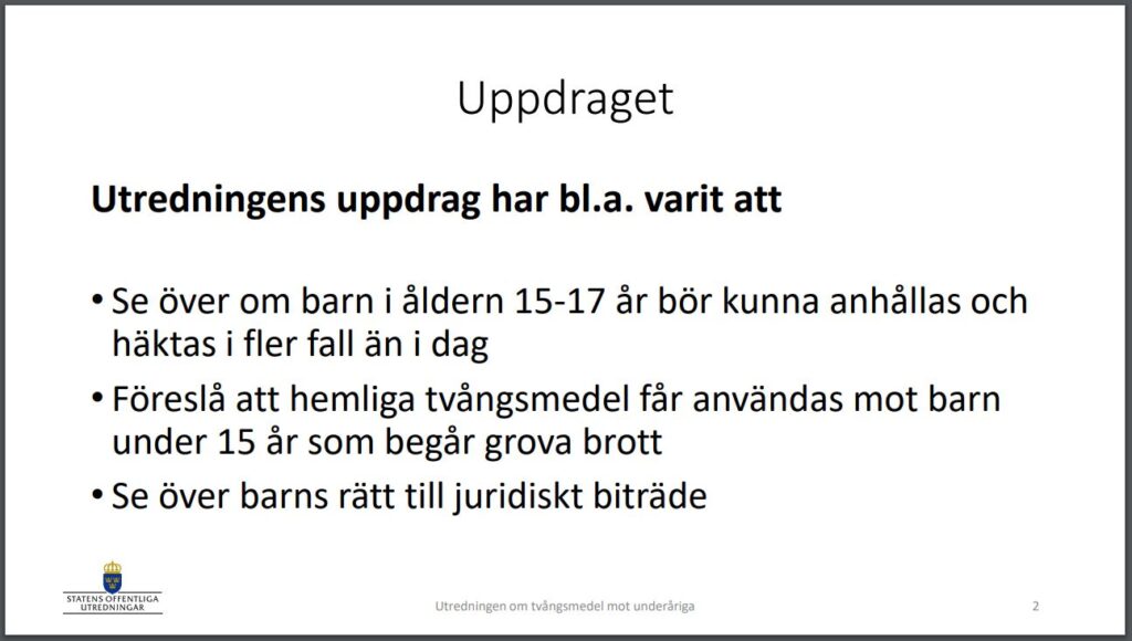 På onsdagen tog justitieminister Gunnar Strömmer (M) emot betänkandet Effektivare verktyg för att bekämpa brott av unga lagöverträdare. Där föreslås bland annat att polisen ska få använda hemliga tvångsmedel mot barn under 15 år.