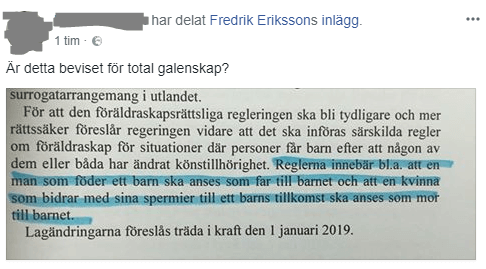 Regeringen kom nyligen med ett lagförslag som kallas ”Modernare regler om assisterad befruktning och föräldraskap” som medför en rad förändringar på området. En uppmärksammad del i lagförslaget pratar bland annat om kvinnors spermier samt män som föder barn.