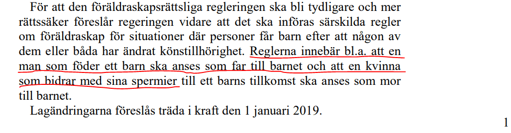 Reglerna innebär bl.a. att en man som föder ett barn ska anses som far till barnet och att en kvinna som bidrar med sina spermier till ett barns tillkomst ska anses som mor till barnet.