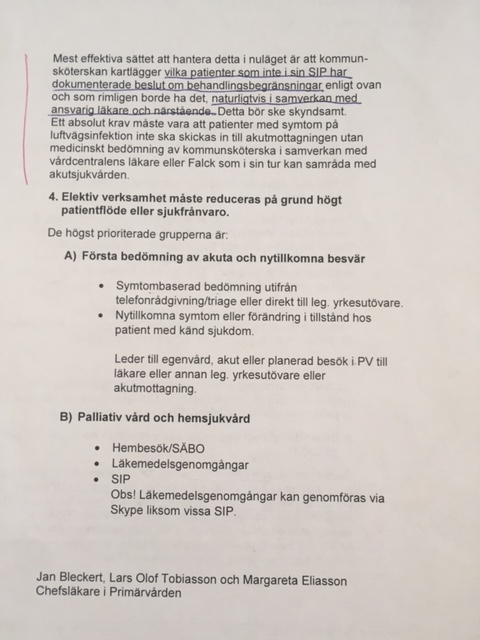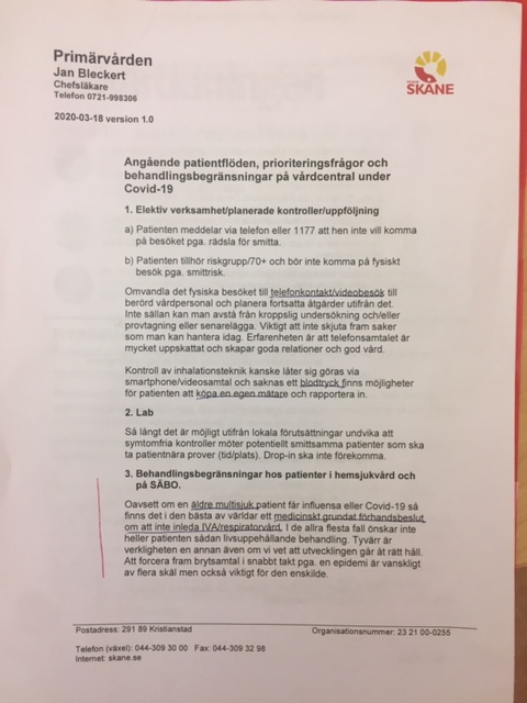 Enligt en källa som arbetar inom primärvården i Skåne hade ett brev underskrivet av chefsläkaren i primärvården i Skåne Jan Bleckert skickats till vårdinrättningar i regionen. Brevet som har rubriken Angående patientflöden, prioriteringsfrågor och behandlingsbegränsningar på vårdcentral under Covid-19 är uppdelat i flera stycken.