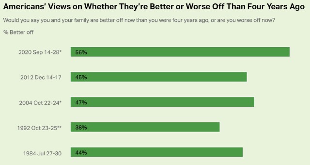 I en undersökning som publicerades nyligen svarade 56 procent av de registrerade väljarna att de har det bättre nu än för fyra år sedan. Det är den högsta siffran någonsin för en sittande president.